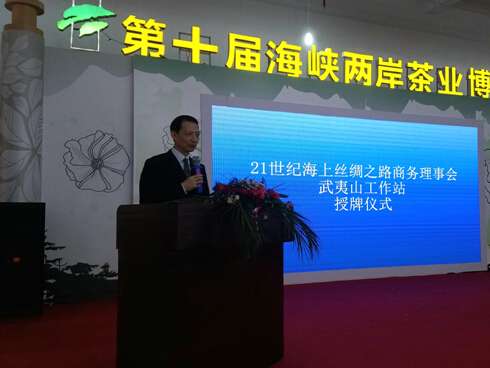 11月17日上午,作为第十届海峡两岸茶业博览会重要活动之一的21世纪海上丝绸之路商务理事会联络办公室武夷山工作站授牌(揭牌)仪式在福建武夷山市凯捷岩茶城举行。