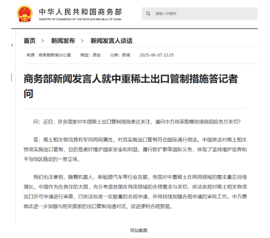 我们也注意到,随着机器人、新能源汽车等行业发展,各国对中重稀土在民用领域的需求量正持续增长。中国作为负责任的大国,充分考虑各国在民用领域的合理需求与关切,依法依规对稀土相关物项出口许可申请进行审查,已依法批准一定数量的合规申请,并将持续加强合规申请的审批工作。中方愿就此进一步加强与相关国家的出口管制沟通对话,促进便利合规贸易。