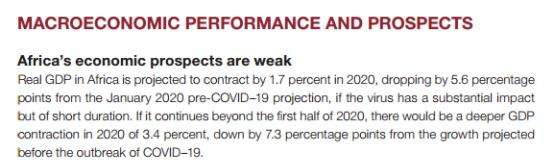 另外,世界银行近期发布《全球经济展望》报告预测,今年撒哈拉以南非洲地区经济将萎缩2.8%,较1月份预测值下调5.8个百分点,经济收缩幅度将创有记录以来之最。世行还预计,由于疫情严重影响经济发展,该地区数百万人可能再次陷入贫困。