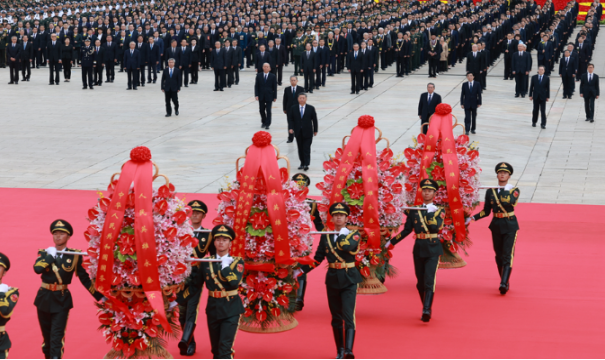 方阵前,以中共中央,全国人大常委会,国务院,全国政协,中央军委,各民主党派、全国工商联和无党派爱国人士,各人民团体和各界群众,老战士、老同志和烈士亲属,中国少年先锋队名义敬献的9个大型花篮一字排开,花篮红色缎带上书写的“人民英雄永垂不朽”格外醒目。