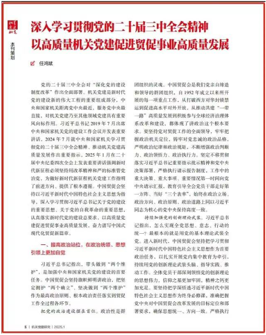 党的二十届三中全会对“深化党的建设制度改革”作出全面部署。机关党建是新时代党的建设新的伟大工程的重要组成部分,中央和国家机关距离党中央最近,服务党中央最直接,对机关党建乃至其他领域党建具有重要风向标作用。习近平总书记2019年7月出席中央和国家机关党的建设工作会议并发表重要讲话,2024年7月就中央和国家机关学习贯彻党的二十届三中全会精神、推动机关党建高质量发展作出重要指示,2025年1月在二十届中央纪委四次全会上发表重要讲话强调新时代新征程必须坚持用改革精神和严的标准管党治党,为做好新时代新征程机关党建工作指明了前进方向,提供了根本遵循。中国贸促会坚持以习近平新时代中国特色社会主义思想为指导,深入学习贯彻习近平总书记关于党的建设的重要思想、关于党的自我革命的重要思想,认真落实新时代党的建设总要求,以高质量党建促进贸促事业高质量发展,奋力谱写中国式现代化贸促新篇章。