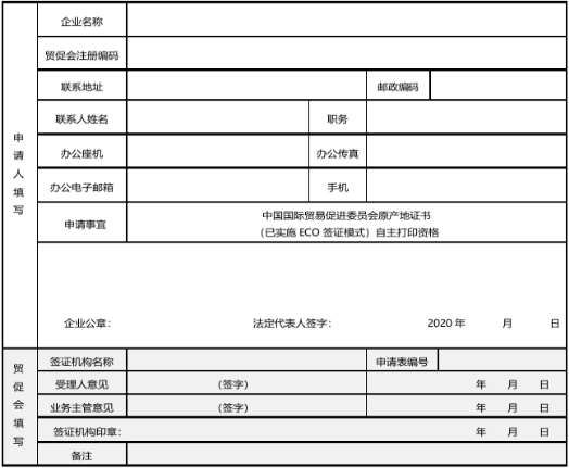 本单位已了解《中国国际贸易促进委员会原产地证书自主打印管理办法(试行)》(以下简称《管理办 法》)有关内容,并向签证机构提交了真实、完整的申请核准资料。自核准具有自主打印资格之日起,我方 承诺: