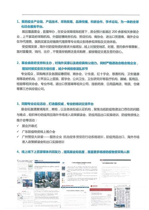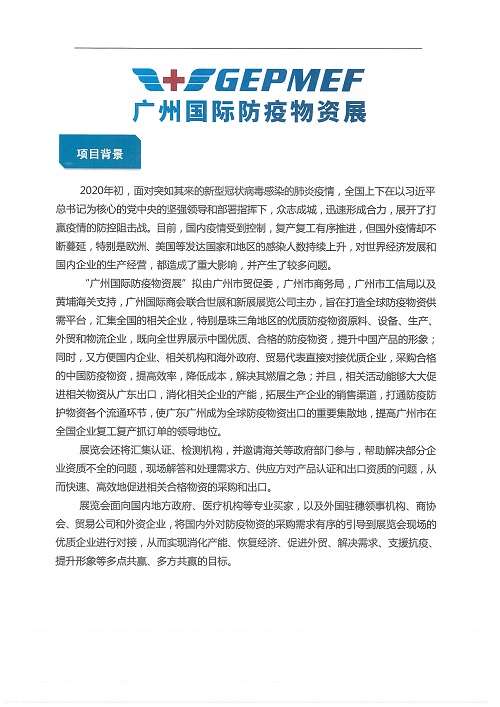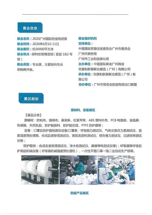 为贯彻落实习近平总书记关于夺取疫情防控和经济社会发展“双胜利”的重要指示精神,根据市委、市政府关于做好“六稳”“六保”的工作要求,由广州市贸促会、广州市商务局、广州市工业和信息化局支持,广州国际商会、世展和新展联合展览(广州)有限九州酷游「中国」官方网站共同主办的“2020年广州国际防疫物资展览会”定于2020年6月10-11日在广州琶洲保利世贸博览馆举办。